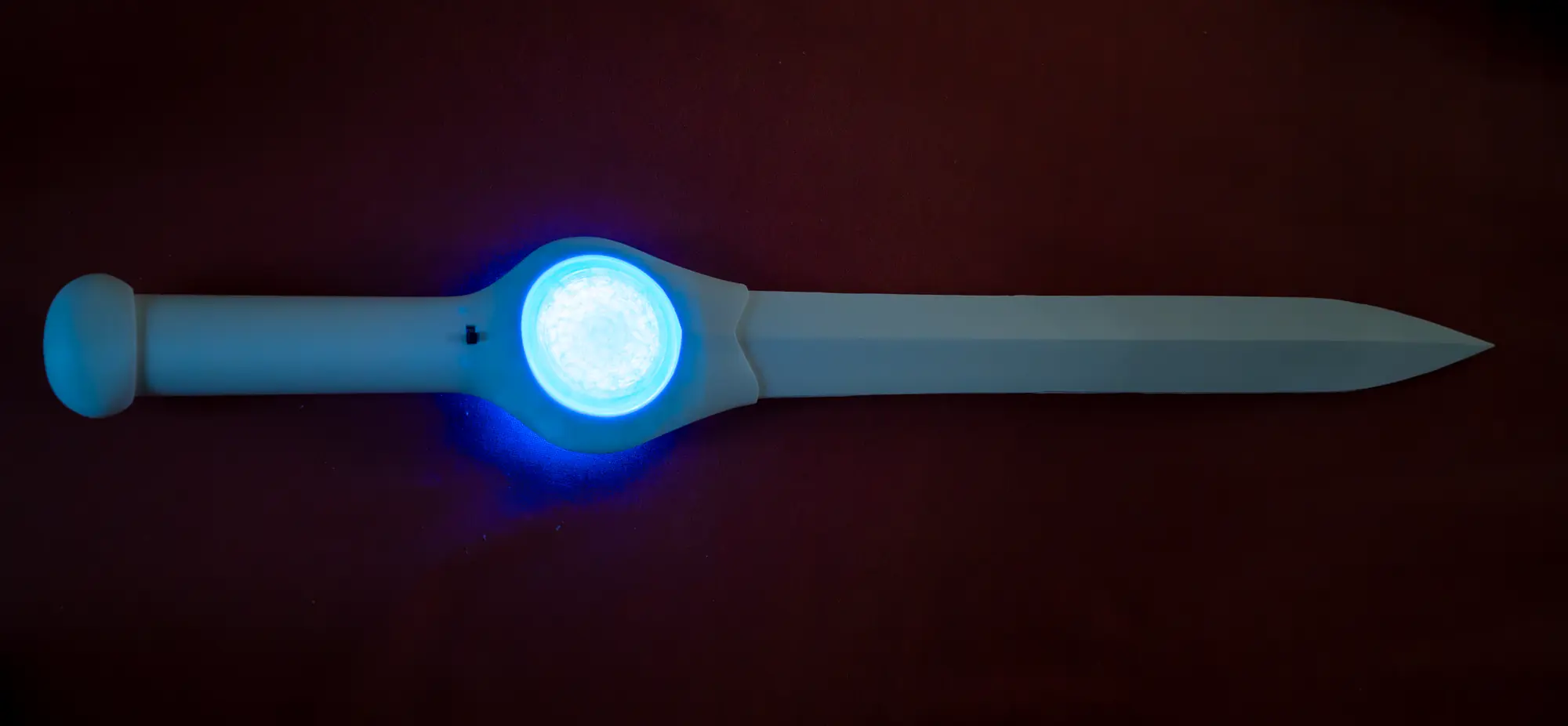 The electronic components were fixed into place inside the hilt and handle sections, hidden away behind the translucent gem embedded into the hilt. Any seams were smoothed out to ensure a seamless appearance. The LED light-up feature was a critical aspect of the project. High-quality 5050 chip LEDs were installed behind the gem, with the wiring neatly routed through the hilt.